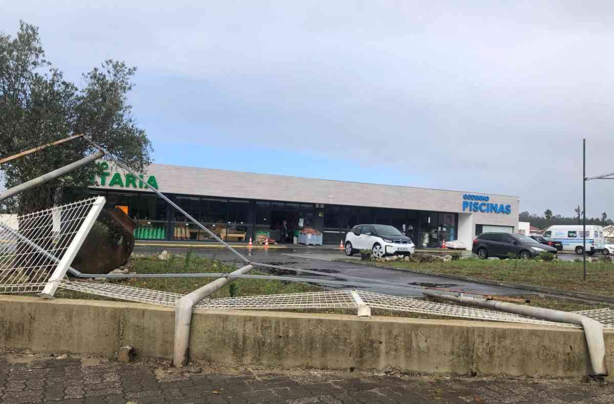 A rede metálica que circunda as instalações da loja e o respetivo parque de estacionamento tinha sido dobrada com a força do vento.
